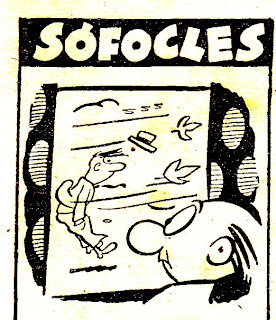 la intemperie, en compañía de un perrazo al que utiliza para conseguirle pares de zapatos por el procedimiento de hacerle aullar durante la noche, y ataviado con ropas llenas de remiendos. En cambio, en los números inmediatamente siguientes, se le ve caminar muy ufano, bien vestido y fumando un espectacular veguero. Lo que no cambia, a lo largo de su existencia, es su insignificancia. Sófocles es casi completamente calvo, no levanta más de un metro del suelo y no tiene profesión conocida. Es tan poca cosa, el bueno de Sófocles, que puede terminar dentro de una pompa de jabón, como en el Pulgarcito 1156, o, como en el 1114, cuando hace autostop, puede terminar recogido por una señora que transporta un cántaro en una carretilla.