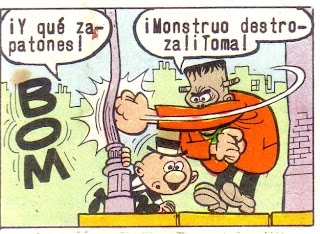 Una entrada francamente "monstruosa", claro... Me ha llamado mucho la atención la viñeta en la que Rompetechos lee claramente lo que pone en el cartel, ¿habría ido al oculista esa mañana? No recuerdo un acierto parecido en toda su historia. Por lo demás, qué buenos recuerdos de Los Monsters que, como apunta Rosaspage, yo conocí en la difusión sabatino-matutina de los ochenta. Y qué amables resultan estos monstruos hoy día, casi dan más ternura que miedo...