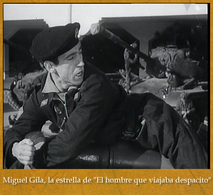 Cuando principia la acción de “El hombre que viajaba despacito”, Gila, que está cumpliendo con el servicio militar obligatorio, está encaramado en el cañón de un tanque. Llama a su camarada Basilio (Julio Riscal) para que le ayude a sacar una naranja que se le ha metido dentro del cañón, más que nada porque teme que el día de
